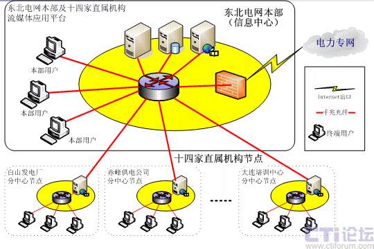 針對(duì)東北電網(wǎng)有限公司的需求,系統(tǒng)采用分布式網(wǎng)絡(luò)結(jié)構(gòu),并在14個(gè)直屬分支機(jī)構(gòu)部署CDN分節(jié)點(diǎn),中心機(jī)房架設(shè)一臺(tái)WEB服務(wù)器,1臺(tái)數(shù)據(jù)庫服務(wù)器,1臺(tái)流媒體服務(wù)器作為CDN中心服務(wù)器,1臺(tái)直播發(fā)布服務(wù)器、2臺(tái)直播采集工作站,14個(gè)分支機(jī)構(gòu)分別架設(shè)1臺(tái)流媒體服務(wù)器作為CDN邊緣服務(wù)器,具體配置如下: