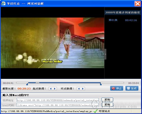 拖動(dòng)進(jìn)度條左右的打點(diǎn)按鈕可以設(shè)定片段的開(kāi)始和結(jié)束時(shí)間點(diǎn),還可以點(diǎn)擊起點(diǎn)微調(diào)和重點(diǎn)微調(diào)的左右箭頭對(duì)截取的視頻進(jìn)行微調(diào),然后點(diǎn)擊“生成”,再點(diǎn)擊“復(fù)制”可以將截取的節(jié)目URL粘貼到WORD、PPT、BBS或BLOG等頁(yè)面中。