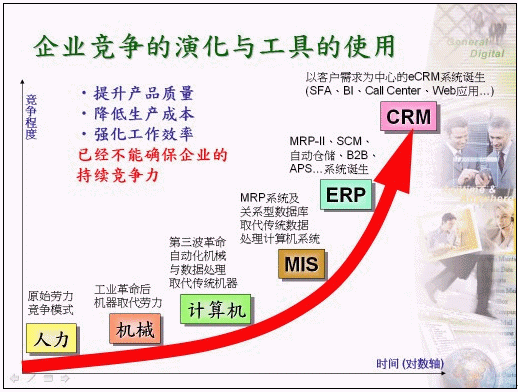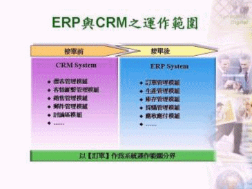 如此龐大的系統(tǒng)以信息技術(shù)角度來看,確實已經(jīng)涵蓋了企業(yè)日常營運作業(yè)的6、7成以上,因此,很多企業(yè)的主管甚或MIS主管認為建置了ERP系統(tǒng)之后其實就已經(jīng)作好企業(yè)e化的工作了,其實仔細思考之后您會發(fā)覺ERP系統(tǒng)還是有其功能限制之處,以業(yè)務單位之銷售工作推展為例,所能享受到的e化成果真是少之又少,許多業(yè)務人員平日最常運用到ERP系統(tǒng)大都為訂單管理部份,只有少部份的業(yè)務人員同時會運用到ERP系統(tǒng)中之報價功能,尤其ERP系統(tǒng)對業(yè)務人員在開發(fā)潛在客戶或作好案例管理方面之應用更是幫助有限。