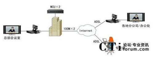 整個方案在部署上極其簡單,紅豆集團(tuán)總部架設(shè)一臺KDV8000C多點控制單元和一臺KDV8000E多點控制單元,全國各地分公司/辦事處的會議室各部署一套TrueSens硬件視頻會議終端,而遍布全國的紅豆男裝專賣店、軒帝尼專賣店內(nèi)則分別部署一套科達(dá)軟件視頻會議終端。集團(tuán)總部采用電信、聯(lián)通的百兆寬帶各一條,各地的分支機(jī)構(gòu)和專賣店則均通過普通的ADSL接入。系統(tǒng)拓?fù)鋱D如下: