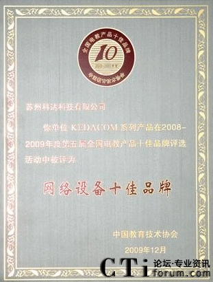 CTI論壇(ctiforum)12月14日消息(記者 張塵):2009年12月4日,由國內(nèi)教育權威機構“中國教育技術協(xié)會”主辦,以讀者調(diào)查問卷的形式舉行的第五屆全國電教產(chǎn)品十佳品牌頒獎典禮在福州梅峰賓館盛大開幕,科達教育視頻會議產(chǎn)品憑借卓越的產(chǎn)品性能和良好的客戶服務入選網(wǎng)絡產(chǎn)品類十佳之列,同時也成為首個入選十佳品牌的視頻會議產(chǎn)品。