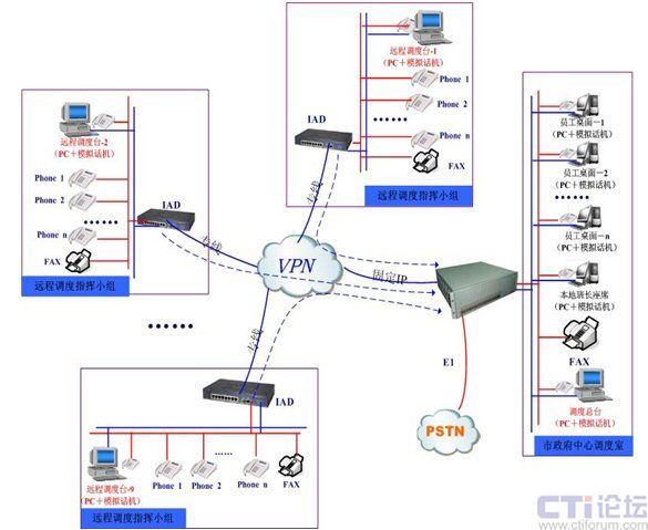 本次項(xiàng)目中,融天科技為大連市政府部署的防火調(diào)度指揮系統(tǒng)涉及點(diǎn)包括市政府中心調(diào)度室和分布在大連市各轄區(qū)的9個(gè)遠(yuǎn)程指揮小組,中心調(diào)度室通過RT-CCP1000一體化調(diào)度平臺(tái)部署10個(gè)中心調(diào)度值班員,轄區(qū)的9個(gè)遠(yuǎn)程指揮小組通過大容量IAD設(shè)備和政府VPN專網(wǎng)遠(yuǎn)程注冊(cè)到中心調(diào)度室RT-CCP1000平臺(tái)上,同時(shí)RT-CCP1000平臺(tái)與本地的PSTN通過一條數(shù)字中繼E1連接,作為系統(tǒng)的出入口。如下圖所示: