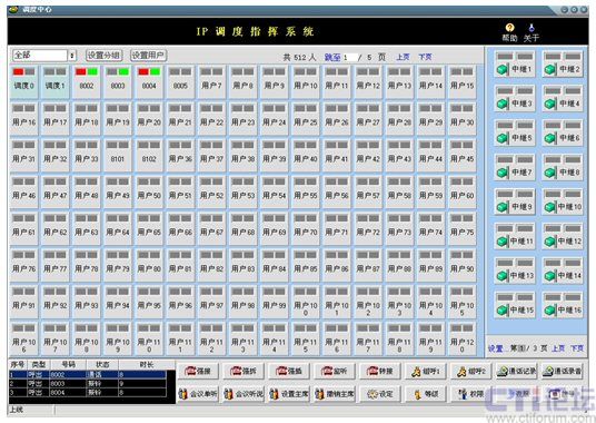 在此界面中實(shí)現(xiàn)了配置管理功能和呼叫相關(guān)功能。配置管理分為:設(shè)置、修改和刪除分組,設(shè)置用戶,設(shè)置中繼,翻頁等功能;呼叫相關(guān)功能:強(qiáng)接、強(qiáng)拆、強(qiáng)插、監(jiān)聽、轉(zhuǎn)接、組呼、設(shè)定等級(jí)、設(shè)定權(quán)限、設(shè)定夜服、會(huì)議相關(guān)等功能。另外,可以在本軟調(diào)度系統(tǒng)中檢索瀏覽相關(guān)通話記錄,并可對(duì)錄音進(jìn)行回放。