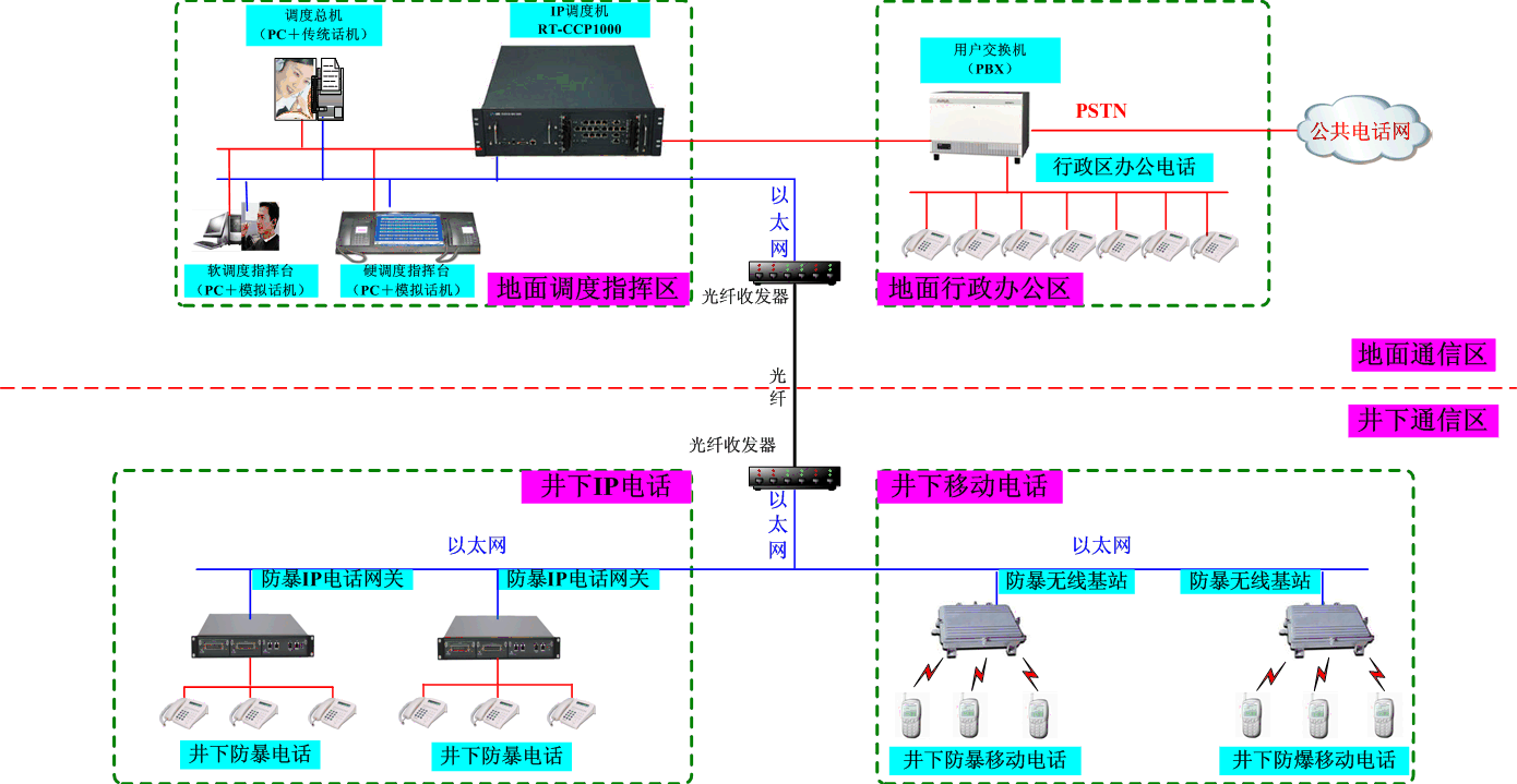 在傳統(tǒng)調(diào)度技術(shù)基礎(chǔ)上完美的將固話網(wǎng)絡(luò)、IP網(wǎng)絡(luò)、無(wú)線網(wǎng)絡(luò)充分融合,可以實(shí)現(xiàn)井上調(diào)度指揮區(qū)及井上行政辦公區(qū)、井下IP電話及井下移動(dòng)電話的互通,也能提供接口與原有的行政辦公電話無(wú)縫整合。同時(shí)也完美的解決了不同網(wǎng)絡(luò)之間、多套系統(tǒng)之間存在兼容性差、共享性差、重復(fù)投資、操作復(fù)雜等諸多缺陷。