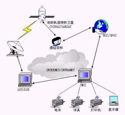 當(dāng)用戶(船舶、飛機(jī)或個(gè)人)遇險(xiǎn)后,遇險(xiǎn)示位信標(biāo)可以通過人工或者自動(dòng)由遇險(xiǎn)時(shí)的撞擊、水浸而激活(信標(biāo)激活后可以存活48/小時(shí)),發(fā)出121.5MHz/243MHz/4O6MHz的遇險(xiǎn)報(bào)警信號,搜救衛(wèi)星則對遇險(xiǎn)示位信標(biāo)發(fā)出的遇險(xiǎn)報(bào)警信號進(jìn)行變頻、存儲、轉(zhuǎn)發(fā)等處理并轉(zhuǎn)發(fā),由幾個(gè)數(shù)據(jù)信號處理器(DSP)對衛(wèi)星的下行信號中的121.5MHz、243MHz、406MHz信號進(jìn)行實(shí)時(shí)處理或?qū)?06MHz信號進(jìn)行延時(shí)處理。由遍布全球的地面處理分系統(tǒng)本地用戶終端(LUT)接收并計(jì)算出遇險(xiǎn)目標(biāo)的位置,把信標(biāo)的報(bào)警數(shù)據(jù)和統(tǒng)計(jì)信息送給相應(yīng)的搜救任務(wù)控制中心(MCC)。
