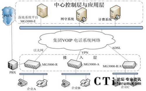 各單位利用自己的網(wǎng)絡(luò)組建集團(tuán)VOIP語(yǔ)音網(wǎng)絡(luò)。無(wú)論是在國(guó)內(nèi)的各單位總部及其分支還是海外的企業(yè)分支,不管是通過(guò)專(zhuān)網(wǎng)還是ADSL等連入集團(tuán)管理平臺(tái),都可以利用這個(gè)管理平臺(tái)傳輸語(yǔ)音業(yè)務(wù),總部和各分支機(jī)構(gòu)可以通過(guò)不同的網(wǎng)絡(luò)接入手段。