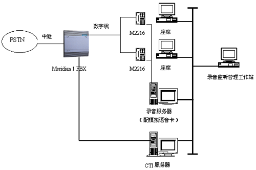使用Meridian 2216 ACD數(shù)字話機上的錄音端口,直接接入模擬語音卡,進行錄音監(jiān)控。其物理結(jié)構(gòu)如下所示: