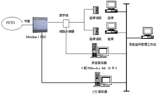 使用Music Telecom PBXmedia DAC 16線數(shù)字PBX錄音監(jiān)聽接口卡,直接與北電Meridian 1交換機的數(shù)字用戶線的分接線連接,實現(xiàn)并線錄音。其物理結(jié)構(gòu)如下所示: