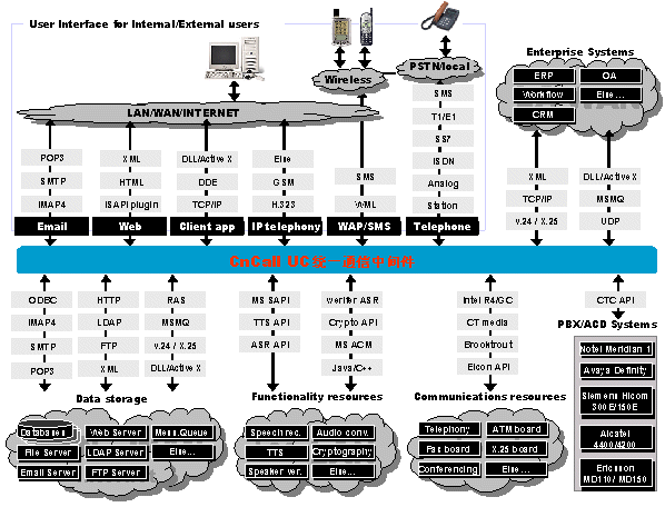 UC統(tǒng)一通信平臺是通信開發(fā)平臺的世界領(lǐng)先者, 提供功能強大而又迅速的開發(fā)技術(shù)來建立復雜的企業(yè)通信服務。這些技術(shù)包括CTI,傳真,數(shù)據(jù)通信,電子郵件,VXML, HTML,ASR,TTS, WAP,數(shù)據(jù)庫接入等。標準接口讓我們方便的與企業(yè)CRM、ERP、OA等系統(tǒng)連接。