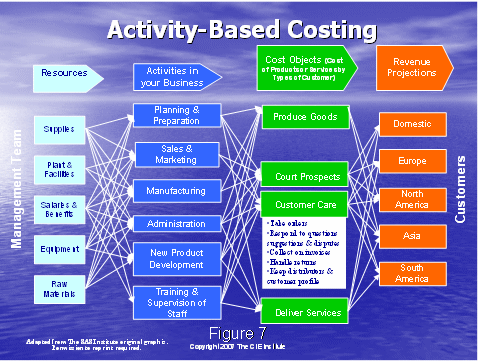 通過了解圖8,我們將以行動成本管理大體是什么的總括作為結(jié)束。我們從左邊的成本驅(qū)動因素開始——這是做工作的原因,例如:獲得客戶,維持客戶。就如圖4中所說的,這些成本驅(qū)動因素可以細(xì)分到工作行動上去?梢酝ㄟ^描述人,培訓(xùn),設(shè)備和技術(shù)資源來組成工作行動。資源驅(qū)動因素被用于分配這些企業(yè)成本到各個行動上去。下一步就是系統(tǒng)地確定行動驅(qū)動因素,分配行動成本到成本對象上去,這有利于決策的制定。例如,獲得一個客戶和維持一個客戶需要花費多少的成本?
