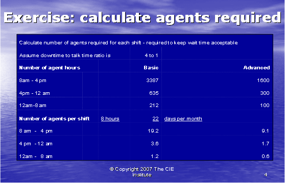 我們現(xiàn)在可以轉(zhuǎn)向下一階段的運算,這一運算決定我們需要多少座席去支持400個客戶。由于技術(shù)支持呼叫中心一天24小時,一周7天進行運營,以及座席必須三班倒工作,使問題更為復(fù)雜。通過測量一天當(dāng)中的話務(wù)量,我們發(fā)現(xiàn)80%的電話聚集在上午八點到下午四點的時間段,15%的電話聚集在下午四點到午夜的時間段,還有5%則在午夜到上午八點的時間段。因此,現(xiàn)在我們用該信息去計算每個排班中所需要的通話時長。表3表明了根據(jù)基礎(chǔ)和高級支持需要而為我們計算出的小時數(shù)。