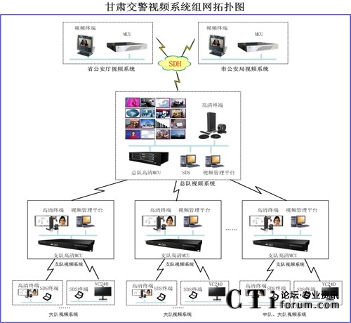 本次建設(shè)的交警總隊視頻會議系統(tǒng),包含覆蓋全省交警總隊、多個支隊、大隊、中隊的大型視頻會議網(wǎng)絡(luò)。其中包含了2個總隊會場16個支隊、100個大隊與16個中隊。交警總隊、支隊、大(中)隊與省公安廳、市州公安局通過SDH專線進行交互訪問,支隊與市州公安局、大隊與區(qū)縣公安局、總隊到各支隊的網(wǎng)絡(luò)均為專線聯(lián)接。