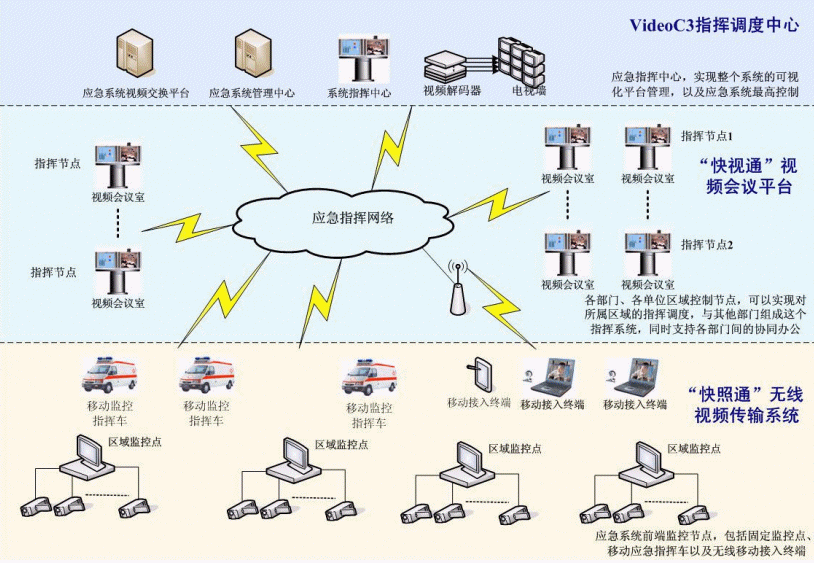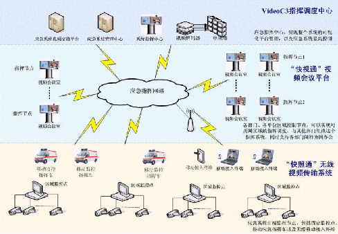 C3I視頻應(yīng)急指揮協(xié)同系統(tǒng)在政府IP網(wǎng)絡(luò)中處于城市的神經(jīng)中樞。它將政府各個(gè)部門、單位聯(lián)系成為一個(gè)整體。在C3I視頻應(yīng)急指揮協(xié)同系統(tǒng)的前端,由"快照通"無線視頻傳輸系統(tǒng)對政府所屬各個(gè)單位進(jìn)行實(shí)時(shí)監(jiān)控,時(shí)刻掌握現(xiàn)場動(dòng)態(tài),該部分支持固定點(diǎn)監(jiān)控,也支持移動(dòng)指揮點(diǎn)和無線移動(dòng)接入終端,保證了前方工作的靈活、機(jī)動(dòng)性;在系統(tǒng)的指揮中心部分,由VideoC3指揮調(diào)度中心來支持,它一方面需要對前端的監(jiān)控信息進(jìn)行控制,同時(shí),要對整個(gè)政府進(jìn)行綜合管理調(diào)度,在發(fā)生突發(fā)狀態(tài)的時(shí)刻,現(xiàn)場前端"快照通"捕獲的相應(yīng)信息通過C3I系統(tǒng)平臺,迅速傳遞至指揮中心部分,政府管理人員通過VideoC3指揮調(diào)度中心對前端進(jìn)行遠(yuǎn)程指揮,在第一時(shí)間緊急處理現(xiàn)場突發(fā)事件;在整個(gè)C3I系統(tǒng)中,政府各個(gè)部門、單位之間通過"快視通"視頻會議平臺進(jìn)行辦公交流,支持各部門間的協(xié)同辦公,同時(shí),也可以通過其實(shí)現(xiàn)對所屬區(qū)域的指揮調(diào)度。