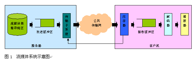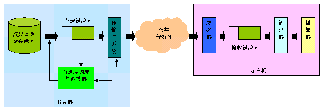 實時自適應網絡帶寬的流媒體傳送技術,是上海清鶴數碼科技公司的一項可大幅提高流媒體寬帶傳送過程中的關鍵服務質量瓶頸的國際技術專利。我們知道,目前制約流媒體寬帶應用發(fā)展的核心問題在于服務質量。簡單地說,由于因特網的狀況是不可靠的,其帶寬、負荷等變化劇烈,這難以滿足流媒體寬帶業(yè)務的實時性服務質量要求,并常常造成播放卡殼、延遲、視頻質量抖動劇烈等不良情況,給使用者感官造成很大影響。所以解決好流媒體寬帶應用的服務質量問題對于流媒體寬帶應用是極為重要的。如圖1所示,在一般的流媒體寬帶系統(tǒng)里,視頻服務器通過網絡向客戶機實時傳送流媒體信息。