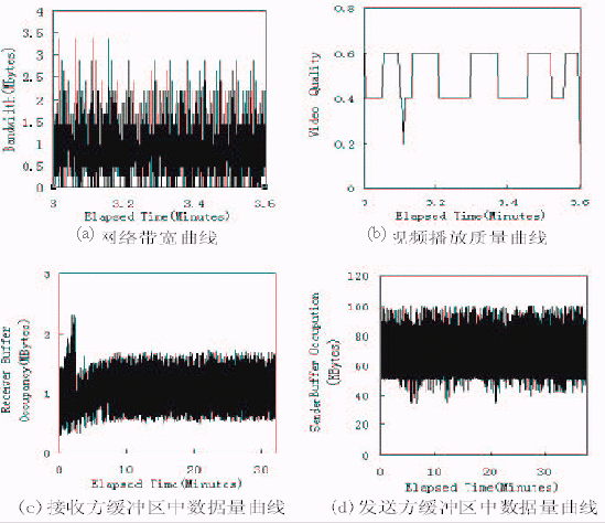 圖3給出了在劇烈的帶寬變化情況下,應用該技術的視頻點播系統(tǒng)所達到的性能。在圖3中,(a)表示所使用的帶寬情況;(b)表示客戶端得到的視頻播放質量;(c)和(d)分別表示在播放過程中接收緩沖區(qū)和發(fā)送緩沖區(qū)中的數據量情況。對比圖3(a)(b)可以看出,在網絡帶寬劇烈變化的情況下,視頻播放質量的變化很平緩。由圖3(c)知,接收方緩沖區(qū)沒有發(fā)生上溢或下溢,這表明客戶始終能享受到連續(xù)的視頻播放,沒有出現(xiàn)播放卡殼;也沒有出現(xiàn)因為緩沖區(qū)上溢而丟失從網絡傳過來的數據。圖3(d)則表明發(fā)送緩沖區(qū)始終在80k字節(jié)左右,沒有發(fā)生下溢,說明數據發(fā)送模塊始終有數據可發(fā),即網絡帶寬得到了充分利用。
