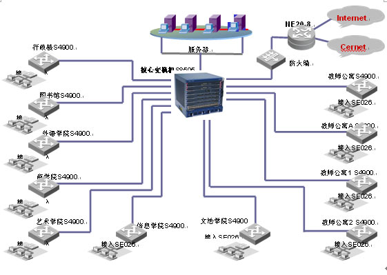 S8505萬兆核心路由交換機作為整個網(wǎng)絡的核心,以高密度、大容量的轉發(fā)性能為豐富的業(yè)務提供支持。Quidway? S8505萬兆核心路由交換機具備178Mpps的處理能力,300G的交換容量,并可以升級到600G;接入采用為教育行業(yè)定制的E026/E050交換機,實現(xiàn)整網(wǎng)的安全接入的完善的帶寬管理功能。網(wǎng)絡出口采用NE20-8第五代路由器實現(xiàn)雙出口,實現(xiàn)靈活的路由策略。
