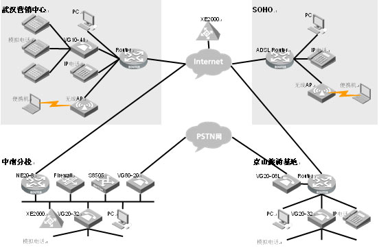 要求實現(xiàn)IP語音網(wǎng)絡向廣域網(wǎng)的擴展,實現(xiàn)IP語音無處不在,內部電話完全免費。并保證廣域網(wǎng)的安全訪問。