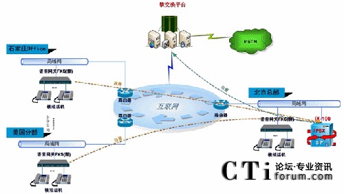 在石家莊,也安裝1臺48FXS語音網關,該網關可接48部模擬話機,通過公網直接注冊至總部的IX-100,作為公司的遠程分機,享受功能和總部的分機完全相同,做到移地仿真的虛擬統(tǒng)一。
