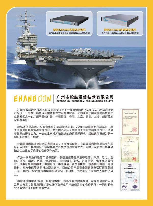 廣州市毅航通信技術(shù)有限公司是專注于下一代通信網(wǎng)絡(luò)(NGN+3G)的通信產(chǎn)品設(shè)計(jì)、研發(fā)、銷售以及整體解決方案的供應(yīng)商。