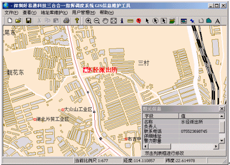 好易通三臺(tái)合一指揮調(diào)度警用地理信息子系統(tǒng)是好易通三臺(tái)合一指揮調(diào)度系統(tǒng)的一個(gè)重要組成部分,主要參考《警用地理信息系統(tǒng)建設(shè)規(guī)范》以及公安部《縣、市級(jí)公安機(jī)關(guān)"三臺(tái)合一"接處警系統(tǒng)技術(shù)規(guī)范》設(shè)計(jì),基于MapInfo平臺(tái)開發(fā),接處警人員可運(yùn)用該子系統(tǒng)對(duì)案發(fā)地點(diǎn)進(jìn)行多中定位(模糊定位、輔助定位),多種查詢及多種調(diào)度。