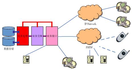 其中,業(yè)務(wù)接口部分為呼叫中心提供面向服務(wù)服務(wù)對象(客戶)的連接和面向服務(wù)者(座席)的連接接口,業(yè)務(wù)交換部分負責(zé)在請求服務(wù)的對象與提供服務(wù)提供者之間建立連接,業(yè)務(wù)處理部分負責(zé)對這些連接及服務(wù)內(nèi)容進行管理和維護,數(shù)據(jù)存儲部分則為所有服務(wù)提供必要的數(shù)據(jù)資源和數(shù)據(jù)備份。