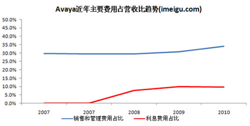 Avaya的成本和費(fèi)用主要由營(yíng)業(yè)成本、銷(xiāo)售和管理費(fèi)用、研發(fā)費(fèi)用、無(wú)形資產(chǎn)攤銷(xiāo)費(fèi)用、利息支出等構(gòu)成。(1)營(yíng)業(yè)成本主要由硬件費(fèi)用、第三方合作伙伴授權(quán)費(fèi)用以及相關(guān)產(chǎn)品和服務(wù)的人力成本組成,2010財(cái)年?duì)I業(yè)成本占營(yíng)收比為57.1%;(2)銷(xiāo)售和管理費(fèi)用定義為銷(xiāo)售和市場(chǎng)活動(dòng)以及管理活動(dòng)相關(guān)的工資薪酬、設(shè)備折舊費(fèi)用等等,2010財(cái)年該項(xiàng)費(fèi)用占比達(dá)30.4%;(3)無(wú)形資產(chǎn)攤銷(xiāo)主要來(lái)自分期攤銷(xiāo)并購(gòu)NES 時(shí)的客戶(hù)關(guān)系價(jià)值,2010財(cái)年占營(yíng)收比4.3%。(4)利息費(fèi)用即相關(guān)債務(wù)的利息支出和規(guī)避利率風(fēng)險(xiǎn)敞口的金融工具費(fèi)用,2010財(cái)年占營(yíng)收達(dá)9.6%。