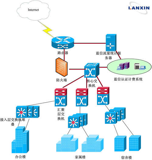 在學校的網(wǎng)絡中心部署藍信認證計費系統(tǒng),負責對用戶的集中統(tǒng)一管理;此外,在網(wǎng)絡的出口處部署藍信流量統(tǒng)計工具,負責對所有流量進行采集,網(wǎng)管者通過客戶端實現(xiàn)對用戶的管理和控制。
