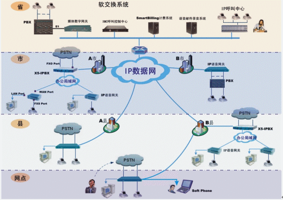 在各級(jí)辦公機(jī)構(gòu)根據(jù)原有用戶數(shù)量,可以配置IP電話綜合接入設(shè)備或IP-PBX,連接當(dāng)?shù)卦械霓k公電話環(huán)境(程控電話交換機(jī)、直線市話、電信虛擬網(wǎng)等)。實(shí)現(xiàn)機(jī)構(gòu)內(nèi)部辦公電話/傳真通過IP數(shù)據(jù)網(wǎng)通信。同時(shí)機(jī)構(gòu)以外的長(zhǎng)途電話/傳真也可以利用IP電話網(wǎng)傳輸,而不產(chǎn)生任何長(zhǎng)途通信費(fèi)用。