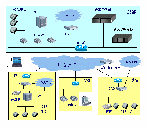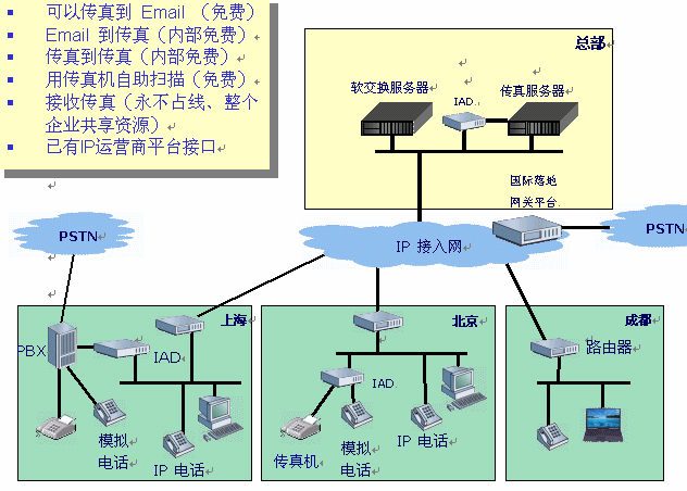 - 內(nèi)部IP電話、傳真網(wǎng)連接各地區(qū)PSTN市話網(wǎng),實現(xiàn)各地區(qū)間"長途電話變市話"