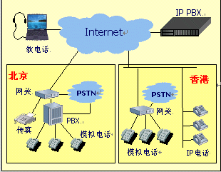 通過網(wǎng)絡電話終端IAD的內(nèi)線口(PHONE),連接當?shù)剞k公電話環(huán)境(程控交換機\電信虛擬網(wǎng)\電話機),實現(xiàn)內(nèi)部電話通過互聯(lián)網(wǎng)通信。通過外線口(LINE)連接PSTN市話網(wǎng),實現(xiàn)注冊的外部移動電話\市話呼入,客戶服務電話的呼入,各地區(qū)間的長途電話的"落地"。