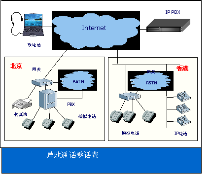 如圖所示,在整個系統(tǒng)中加入“訊時捷™ IPX”系統(tǒng)平臺設(shè)備后,各點之間話費(fèi)為零。