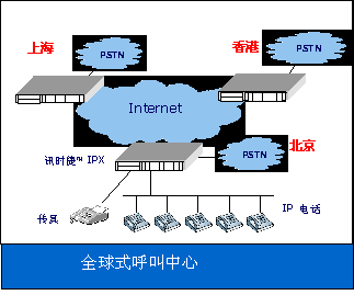 美國訊時捷™科技公司的“訊時捷™™ IPX”系統(tǒng)平臺,可以作為分布式的IP呼叫中心,并可利用各地的網(wǎng)關(guān),提供低費(fèi)用的IP