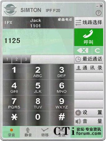 企業(yè)版需要另行購(gòu)買(mǎi),突出的功能包括“電子通信錄”、“軟電話與臺(tái)式電話機(jī)綁定”等!半娮油ㄓ嶄洝惫δ芤杨A(yù)裝在軟電話中,就像手機(jī)的通訊薄一樣。企業(yè)的員工不需要自己逐條輸入通訊錄,錄入與更新由企業(yè)的系統(tǒng)管理員在企業(yè)的通訊服務(wù)器上進(jìn)行,一人操作,全公司通訊錄同步更新。一個(gè)集團(tuán)公司或政府機(jī)構(gòu)有成百上千個(gè)員工很正常,但要讓大家記住這幾百個(gè)電話號(hào)碼就很困難了,目前較為常見(jiàn)的解決辦法有以下幾種,小一點(diǎn)的企業(yè)或機(jī)構(gòu)通常會(huì)打印一張通訊錄發(fā)放給每個(gè)員工,員工撥號(hào)前會(huì)先查一下這張通訊錄然后再將電話號(hào)碼在臺(tái)式辦公電話機(jī)上逐個(gè)輸入;規(guī)模大一點(diǎn)的企業(yè)會(huì)專(zhuān)門(mén)印制一本通訊薄發(fā)給每個(gè)員工,但由于機(jī)構(gòu)龐大,往往等到通訊簿發(fā)到手上,其中有很多電話號(hào)碼已經(jīng)不正確了。F20型軟電話的“與臺(tái)式電話機(jī)綁定”功能就很好的解決了這個(gè)問(wèn)題,通過(guò)將電腦上的軟電話與辦公桌上的臺(tái)式電話機(jī)進(jìn)行綁定,企業(yè)中的所有員工在打電話時(shí),都可以先點(diǎn)擊電腦軟電話中的通訊錄,快速找到需要的電話號(hào)碼,然后只需點(diǎn)擊這個(gè)號(hào)碼條,這個(gè)員工的臺(tái)式電話機(jī)就會(huì)自動(dòng)向目標(biāo)電話進(jìn)行撥號(hào),待對(duì)方摘機(jī)后,這個(gè)員工的臺(tái)式電話機(jī)就會(huì)響起鈴聲,此時(shí)摘機(jī)就可進(jìn)行通話了。確實(shí)夠方便,夠?qū)嵱茫?