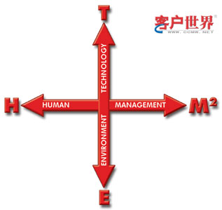 THEM2方法把呼叫中心看成是由技術(shù)(Technology)、人(Human)、環(huán)境(Environment)、管理(Management)組成的整體。這個方法的圖示是一個十字架(見圖一),M之上的2字的意思是說,所考慮的管理包括戰(zhàn)略管理(Strategic Management)和運營管理(Operational Management)兩個層面。