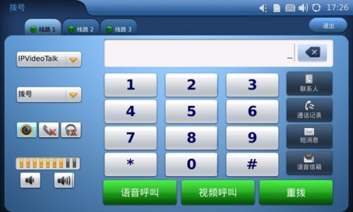 7寸大屏搭配寬大的數(shù)字虛擬鍵盤,讓你的撥號準(zhǔn)確無誤。同時界面的所顯示的通話功能諸如查找聯(lián)系人、查找通話記錄、發(fā)送短消息或者快速進(jìn)入語音信箱等功能也清晰明了?梢园l(fā)現(xiàn)的是,用戶在輸完號碼之后可自主選擇采用語音呼叫還是視頻呼叫。另外,同潮流網(wǎng)絡(luò)之前的一款視頻電話GXV3140一樣的是,GXV3175也在出廠自帶了一個IPVideoTalk賬號。該賬號是出廠時就已配置好的,每一臺電話配備一個號碼并顯示在桌面上。也就是說,用戶在拿到GXV3175并聯(lián)網(wǎng)之后即可使用該賬號撥打免費(fèi)的視頻電話了。這可是很多廠商所沒有的特殊功能。下面我們就使用隨機(jī)附送的IPVideoTalk賬號來撥打視頻電話。
