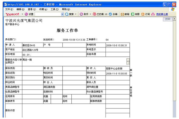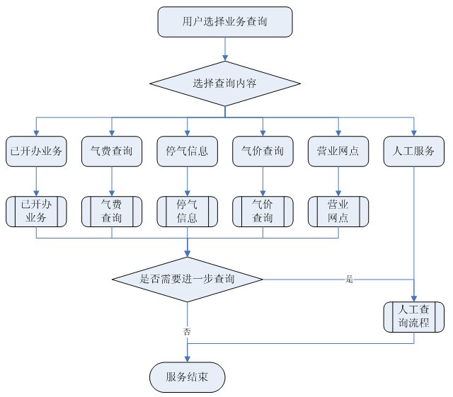 業(yè)務(wù)查詢:用戶可通過受理人員或自動(dòng)語音應(yīng)答系統(tǒng)根據(jù)用戶要求從數(shù)據(jù)庫查詢資料,然后通過語音方式播報(bào)或送到用戶指定傳真機(jī)或其他終端設(shè)備上。應(yīng)考慮以后用web方式查詢氣費(fèi)等數(shù)據(jù),以不動(dòng)及主體設(shè)備方式平滑升級。
