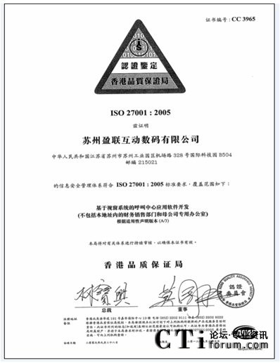 2009年9月28日,蘇州盈聯(lián)公司獲得了由國際權威認證機構香港品質(zhì)保證局頒發(fā)的ISO 27001:2005(信息安全管理體系ISMS)國際認證證書,這標志著蘇州盈聯(lián)公司繼2008年7月通過CMMI3級評估之后又一見證企業(yè)資質(zhì)與能力的重要里程碑。