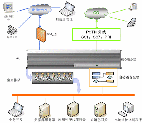 2. 業(yè)務(wù)控制層:ACD、IVR、呼叫統(tǒng)計分析、坐席質(zhì)量管理、系統(tǒng)配置管理、業(yè)務(wù)分析平臺、預(yù)測外撥管理、工作流平臺、坐席資源管理、分布互連機制、雙機熱 備機制;