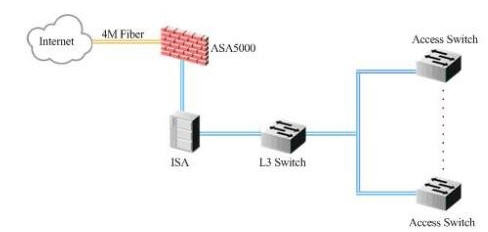 辦公專用網(wǎng)通過一條4M光纖線路連入CNC網(wǎng)絡(luò),在酒店內(nèi)部安裝了ASA5000和ISA等安全管理設(shè)備,ISA承擔(dān)了NAT等功能;辦公網(wǎng)的信息點(diǎn)數(shù)量大概在200個左右。