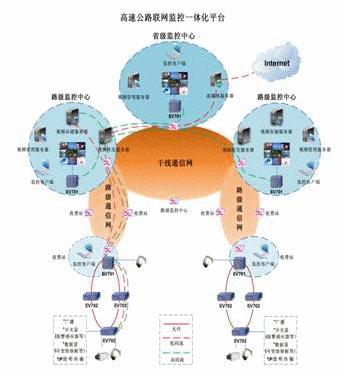 高速公路聯(lián)網(wǎng)監(jiān)控系統(tǒng)是把路段實(shí)時(shí)視頻圖像、交通流量數(shù)據(jù)、路段封閉情況、交通事故情況、氣象數(shù)據(jù)、隧道內(nèi)環(huán)境數(shù)據(jù)、各外場(chǎng)設(shè)備工作狀態(tài)、各種告警異常以及施工情況等即時(shí)信息進(jìn)行編輯匯總,通過(guò)通信網(wǎng)絡(luò)實(shí)時(shí)上傳到路段監(jiān)控中心、監(jiān)控分中心和省級(jí)監(jiān)控中心,省中心對(duì)采集的各種數(shù)據(jù)進(jìn)行統(tǒng)計(jì)分析處理,以表格和曲線顯示,對(duì)各外場(chǎng)設(shè)備的工作狀態(tài)以圖標(biāo)顯示,并通過(guò)發(fā)布控制指令給相應(yīng)分中心監(jiān)控系統(tǒng),對(duì)可變情報(bào)板,可變限速標(biāo)志等交通誘導(dǎo)設(shè)備進(jìn)行控制,以此方便行路者了解最新路況,使管理者能夠監(jiān)控實(shí)時(shí)路況信息,達(dá)到使用與監(jiān)控的統(tǒng)一。