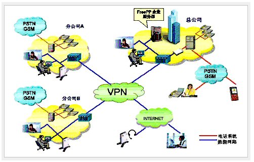 FreePP獨有的群組功能可以幫助企業(yè)將其總部與分支機構(gòu)原本各自獨立的若干個PBX整合成為一個PBX,實現(xiàn)Internet、PSTN網(wǎng)絡上通信應用的融合,幫忙企業(yè)擺脫對傳統(tǒng)通信運營商的依賴,完全掌握自己的通信網(wǎng)絡。通過為PBX外線上的若干個FreePP Box (或MPES)分配一個Group Number,PBX內(nèi)線上的分機按照PBX上的設定來獲取Group Number中的一個FreePP Box,進而通過這個FreePP Box來呼叫另外一組Group Number 連接的PBX分機號碼。他們相互間的通信完全基于Internet實現(xiàn),無需象傳統(tǒng)方式那樣交納通信費用。