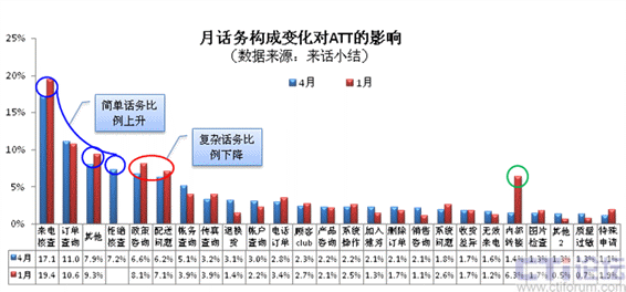 為了分析“話務(wù)構(gòu)成”和“業(yè)務(wù)周期”影響ATT的關(guān)聯(lián)性,我們還是取08年1月和4月的來話小結(jié)分布比例占前5位的數(shù)據(jù),進行參考分析:(下圖11)
