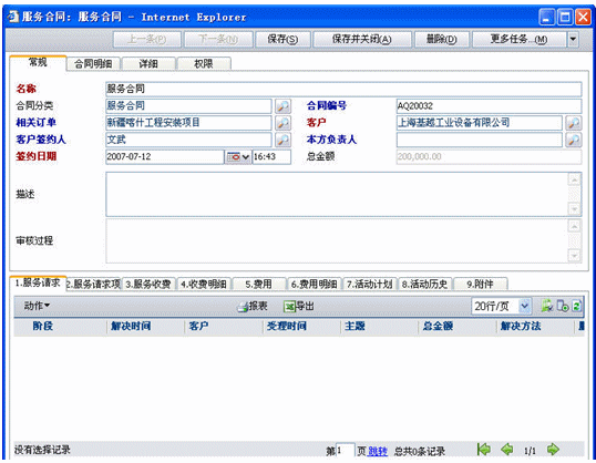 服務(wù)合同是也分為兩種,一種是非公司項目的服務(wù)請求此時沒有與訂單關(guān)聯(lián);二種是公司項目后服務(wù)請求,此時可以關(guān)聯(lián)訂單也可以不關(guān)聯(lián)訂單,如果關(guān)聯(lián)訂單就可以將訂單產(chǎn)品明細(xì)導(dǎo)入合同明細(xì)中(導(dǎo)入明細(xì)是可以調(diào)整數(shù)量和價格的).