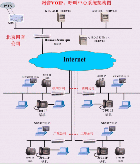 網(wǎng)音公司作為NBX產(chǎn)品總代,與全國各地的分銷公司之間建立一套網(wǎng)絡(luò)電話通訊系統(tǒng),本系統(tǒng)包括各公司之間的IP電話互通、分步式呼叫中心、NBX電話辦公助理、錄音等多種業(yè)務(wù)。