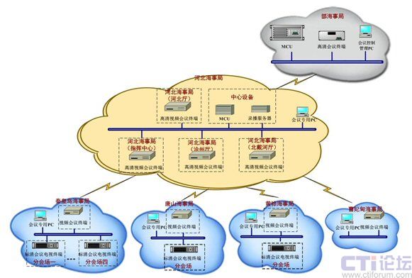 由于前期視頻會議系統(tǒng)測試時表現(xiàn)出來的良好的兼容性和出色的視音頻效果,河北海事局采用了迪威公司的高清產(chǎn)品及解決方案。按照組織機構(gòu)的分級結(jié)構(gòu),部海事局采用現(xiàn)有的高清MCU和本局部的高清終端;河北海事局部署高清MCU,既能召開本地視頻會議,又能與部海事局進行級聯(lián),實現(xiàn)召開大會的要求,同時在本地的指揮中心、各會場放置1臺高清會議終端,在下屬海事處配置1臺標清會議終端。