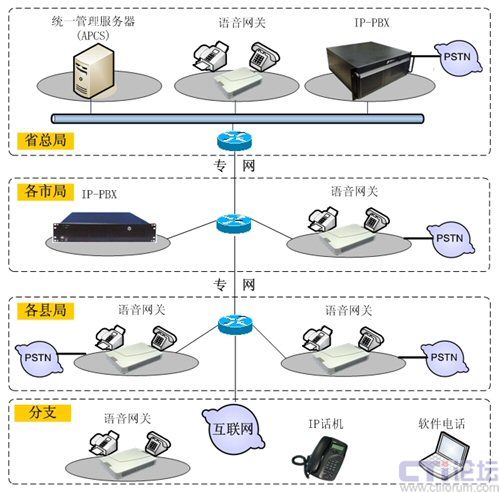 摘要:公司Zed-3(捷思銳科技)公司借助工商系統(tǒng)現(xiàn)有的數(shù)據(jù)專網(wǎng),在省局部署大型IP PBX,負責省局的分機注冊以及整套系統(tǒng)的路由規(guī)劃,在各市局部署中型IP PBX,負責市、縣局的分機注冊――充分利用現(xiàn)有資源、降低工作費用,擴展新業(yè)務(wù),推進工商系統(tǒng)通信網(wǎng)絡(luò)的全面提升。
