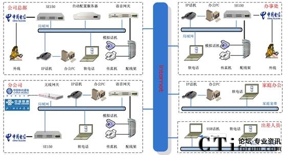 分布式部署:總部和各分支機(jī)構(gòu)的分機(jī),是通過(guò)IP網(wǎng)絡(luò)融合在一個(gè)語(yǔ)音平臺(tái)上來(lái)實(shí)現(xiàn)內(nèi)部通信?偛亢娃k事處分機(jī)、家庭辦公分機(jī)、出差人員的軟電話均注冊(cè)在總部的SE150上,各分公司的分機(jī)注冊(cè)在本地的SE150上,由本地的SE150管理。