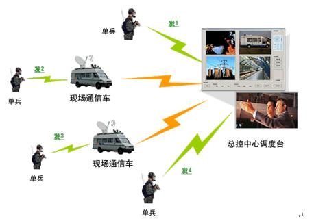 在具體應(yīng)用中,工作人員(士兵)攜帶單兵背負(fù)終端深入現(xiàn)場(災(zāi)區(qū)、廣場、戰(zhàn)場等),將現(xiàn)場視頻實(shí)時回傳到后方的應(yīng)急通信車或指揮中心,同時現(xiàn)場人員可以和指揮中心建立雙向語音通信,指揮中心根據(jù)現(xiàn)場真實(shí)的視頻信息并結(jié)合現(xiàn)場人員語音匯報,可以做出更有針對性、更具準(zhǔn)確性的指揮決策。