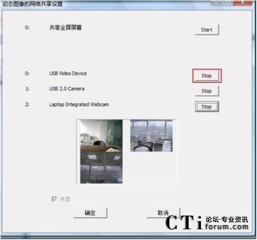打開動態(tài)圖像網(wǎng)絡(luò)共享圖像設(shè)置列表,可以看到共享全屏屏幕下面有3個不同的顯示,這表示在這臺電腦上一共插了3個攝像機(jī),點擊顯示欄右側(cè)的“start”,就可以把攝像機(jī)的圖像設(shè)置為共享的圖像,這3個攝像機(jī)可以同時共享,也可以只設(shè)置其中的某一個。點擊“start”后按鈕就會變?yōu)椤皊top”,這時攝像機(jī)所獲取到得圖像也會在列表中顯示。下圖是將3個攝像機(jī)都設(shè)為共享的圖像的效果: