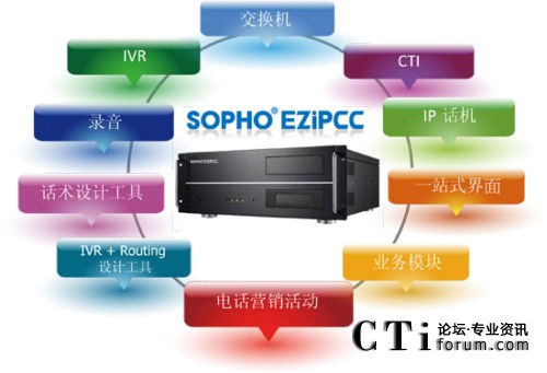 SOPHO EZiPCC(簡(jiǎn)稱EZiPCC) 基于IP為核心技術(shù)的平臺(tái),以All-In-One 的設(shè)計(jì)理念,提供一體化呼叫 中心解決方案,其中包含了呼叫中心所需要的基本話務(wù)系統(tǒng),例如:PBX,IVR,Recording,CTI